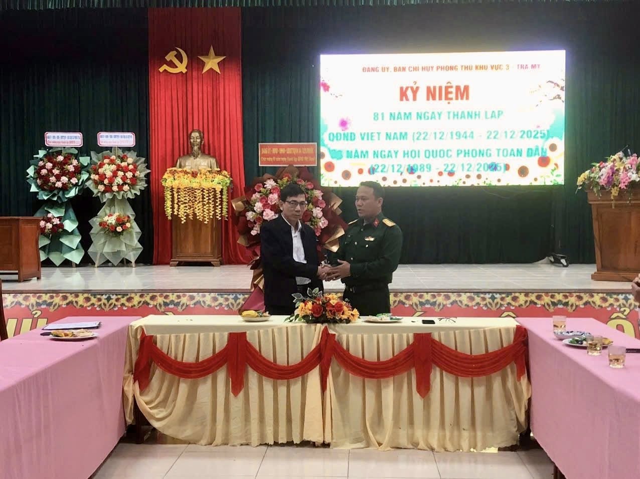 Nhân kỷ niệm 81 năm Ngày thành lập Quân đội Nhân dân Việt Nam (22/12/1944 – 22/12/2025) và 36 năm Ngày hội Quốc phòng toàn dân (22/12/1989 – 22/12/2025), lãnh đạo Đảng ủy, Hội đồng nhân dân, Ủy ban nhân dân, Ủy ban Mặt trận Tổ quốc Việt Nam xã Tiên Phước đã tổ chức đoàn công tác đến thăm, chúc mừng và động viên cán bộ, chiến sĩ Ban Chỉ huy Phòng thủ khu vực 3 – Trà My. Đoàn công tác do đồng chí Nguyễn Hồng Minh – Bí thư Đảng ủy, Chủ tịch Hội đồng nhân dân xã Tiên Phước làm trưởng đoàn.