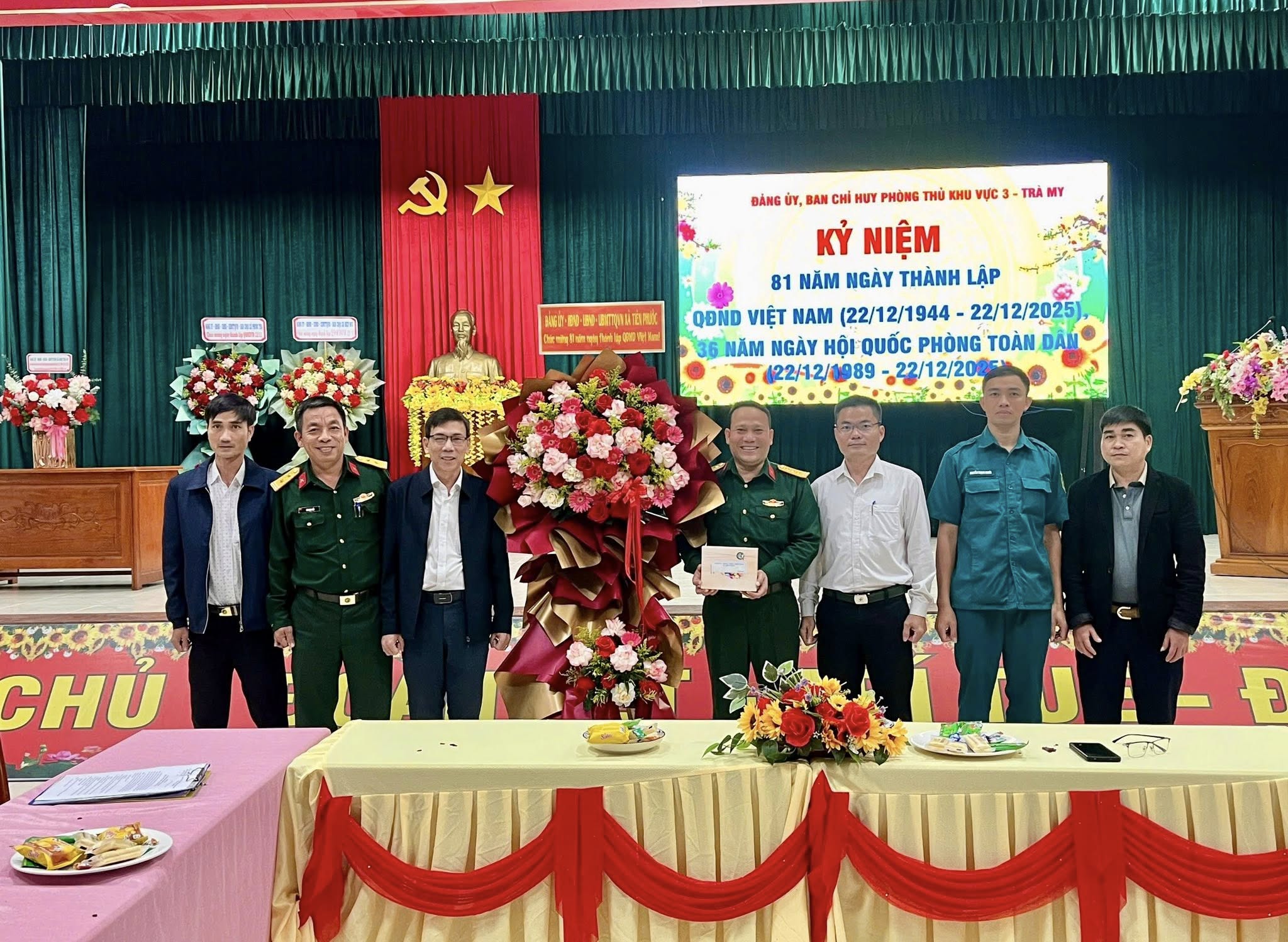 Nhân kỷ niệm 81 năm Ngày thành lập Quân đội Nhân dân Việt Nam (22/12/1944 – 22/12/2025) và 36 năm Ngày hội Quốc phòng toàn dân (22/12/1989 – 22/12/2025), lãnh đạo Đảng ủy, Hội đồng nhân dân, Ủy ban nhân dân, Ủy ban Mặt trận Tổ quốc Việt Nam xã Tiên Phước đã tổ chức đoàn công tác đến thăm, chúc mừng và động viên cán bộ, chiến sĩ Ban Chỉ huy Phòng thủ khu vực 3 – Trà My. Đoàn công tác do đồng chí Nguyễn Hồng Minh – Bí thư Đảng ủy, Chủ tịch Hội đồng nhân dân xã Tiên Phước làm trưởng đoàn.